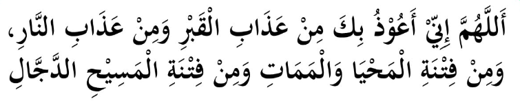 Allahumma inni a’udzubika min adzabil qabri wa min ‘adzabin nar, wa min fitnatil mahya wal mamat wa min fitnatil masihid Dajjal.