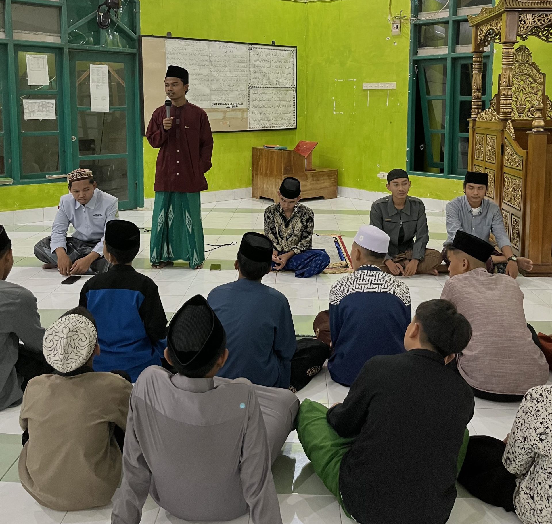Foto ini merekam suasana pembelajaran dalam Program Da’i Nusantara Angkatan II. Seorang guru duduk di depan kelas, menyampaikan pelajaran agama kepada para santri yang duduk melingkar di lantai. Meskipun ruangan tampak sederhana, atmosfernya terasa hangat dan penuh semangat belajar. Para santri terlihat serius dan antusias mendengarkan penjelasan dari sang pembina.